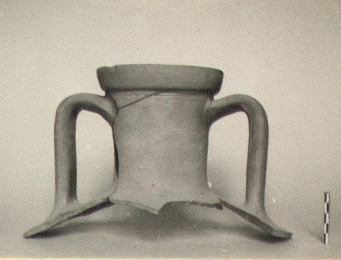 | Description: | a) Neck, both handles, and part of shoulder, mended from five pieces. Broad rim. Neck narrows toward shoulder, and is pressed together at top by handles. Broad rising handles that descend vertically; no finger impressions. Groove just below rim. b) The foot of probably a similar jar, with lower part of body. The body narrows to the foot; which is a collar, hollow beneath as on P 18988. Micaceous red clay, with pinkish-buff surface. Cf. for shape P 21985, P 12655, P 18988. | |