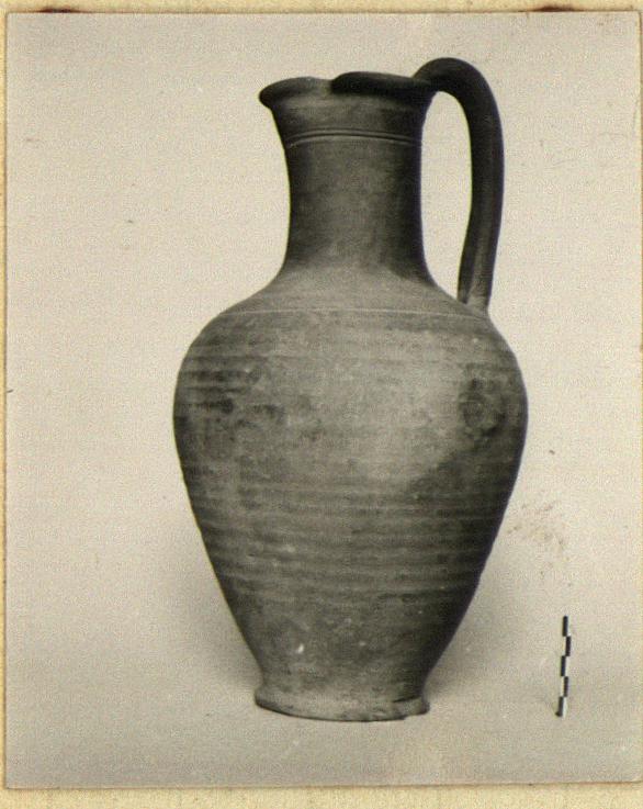 | Description: | Intact save for chips from foot. Ring foot; slender ovoid body; concave shoulder rising into neck; trefoil lip; vertical ridged handle rising above lip. Body lightly wheel-ridged. Grooves at levels of lower and upper handle attachments. Reddish-brown clay. Unglazed. | |