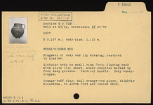 | Description: | Fragment of body and lip missing; restored in plaster. Small ring foot; globular body; short, steep shoulder marked by four deep grooves; flaring neck with plain lip; vertical handle. Body wheel-ridged. Orange-buff clay. Dull orange-red glaze, slightly micaceous, to above foot and inside neck. ADDENDA Badly broken in moving; fragm. in paper bag under bottom shelf. | |