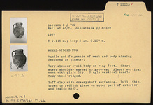 | Description: | Handle and fragments of neck and body missing; restored in plaster. Ring foot; very slender ovoid body; short, steep shoulder marked by grooves; almost vertical neck with plain lip; single vertical handle. Body wheel-ridged. Buff clay with creamy-buff surfacing. Dull, thin, brown to reddish glaze on upper part of exterior and inside neck. | |