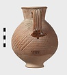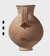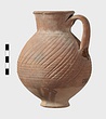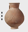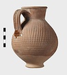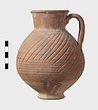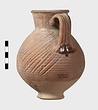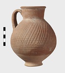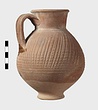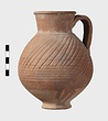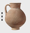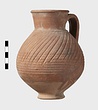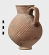 | Description: | Intact. Ring foot; globular body; high, slightly flaring neck with rolled lip; broad vertical grooved handle. Center of body wheel-ridged. Upper half of body marked with diagonal gouging which crosses over the wheel ridging. Dark pinkish-buff clay with bits. Dull brownish glaze on upper part of body. | |