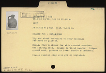 | Description: | Lip and about one-third of body missing; restored in plaster. Flat bottom; squat body; rounded shoulder; flaring neck; single vertical handle. Ridges around neck. Grooves at lower handle attachment. Coarse reddish clay with grits. Unglazed. | |