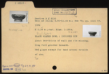 | Description: | About two-thirds of wall and rim missing. Ring foot grooved beneath; incurved rim. Red glaze except for band around outside of rim. | |