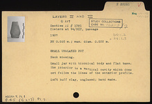 | Description: | Neck missing. Small jar with biconical body and flat base. The interior is a vertical cavity which does not follow the lines of the exterior profile. Soft buff clay, unglazed; handmade. | |