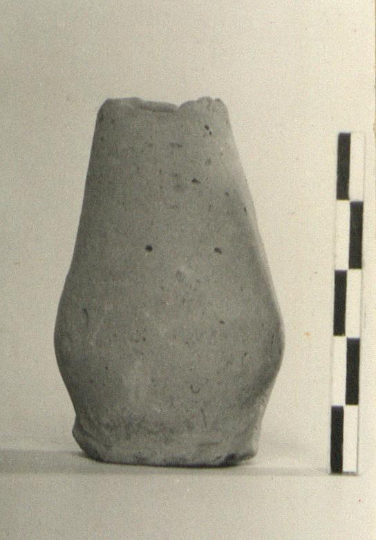 | Description: | Neck missing. Small jar with biconical body and flat base. The interior is a vertical cavity which does not follow the lines of the exterior profile. Soft buff clay, unglazed; handmade. | |
