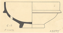 | Description: | Two non-joining fragments preserve full profile; restored in plaster. Shallow hemispherical Pergamene cup on ring foot; wall terminates in a vertical rim offset by a keel. Typical Pergamene clay and glaze; the glaze much worn on interior. Cf. P 9868. Cf. Agora XXXII, no. 788 (P 9868). | |
