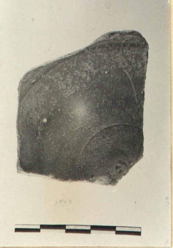 | Description: | Single fragment of floor and foot. From a plate with convex floor on low ring foot. Two grooves on floor and at center a device stamp: rosette. The shape possibly as Samian A type I (cf. P 9866). Reddish clay; brownish-red glaze inside and out, with a slight metallic lustre on exterior. | |