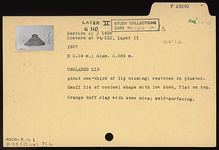| Description: | About one-third of lip missing; restored in plaster. Small lid of conical shape with low knob, flat on top. Orange-buff clay with some mica; self-surfacing. Unglazed. | |