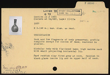 | Description: | Neck and few fragments of body preserved; profile complete except for center of base; restored in plaster. Globular body with flattened base; high narrow neck with small projecting horizontal lip. Hard reddish clay fired gray at core. Reddish to black glaze inside lip and on upper half of neck. | |