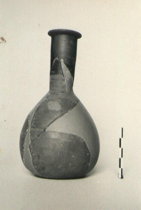 | Description: | Neck and few fragments of body preserved; profile complete except for center of base; restored in plaster. Globular body with flattened base; high narrow neck with small projecting horizontal lip. Hard reddish clay fired gray at core. Reddish to black glaze inside lip and on upper half of neck. | |