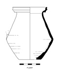 | Description: | About two-thirds of body and all of handle missing. Profile complete except for center of base; restored in plaster on basis of P 20827. Biconical body on flat base; flaring moulded lip. Single vertical handle, rising above lip, with single vertical groove. Rather coarse buff clay; dull red glaze over most of exterior and inside lip. | |