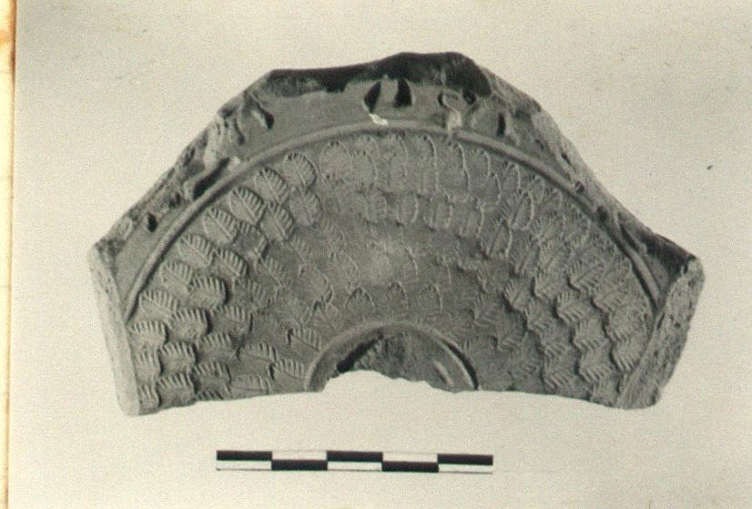 | Description: | Broken all around. About half of bottom and lower zone preserved; medallion missing. Small imbricated leaves in lower zone; feet of goats on broken edge above. Clean pinkish-buff clay. | |