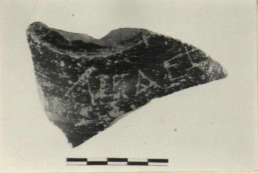 | Description: | Broken all around. Fragment from wall of black-glazed bowl(?) with flaring sides and concave bottom. Abcedarium. Scratched around the outside: <graphic> Glazed inside and out, the glaze uneven and much chipped outside. | |