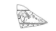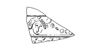 | Description: | Wall fragment broken all around. On the wall, a large mask with a daisy chain leading off to another(?). Raised band above and below; scale pattern below lower band. Dull brown glaze. Non-Attic. | |