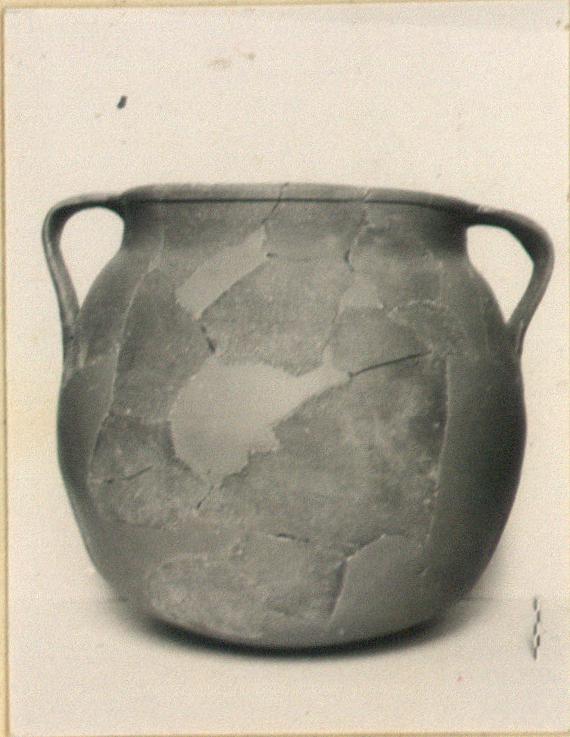 | Description: | Mended from many fragments. Restored in plaster. Round bottom; wide mouth; rim slightly thickened; two strap handles rising to rim. Gritty red clay. | |