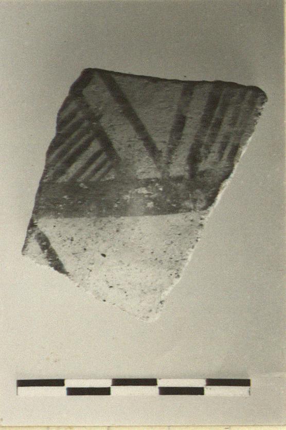 Description:   Matte-painted decoration. Broken all around. Preserves small fragment of wall of vessel, with hatched triangles above dark band in brown paint on dull greenish surface.