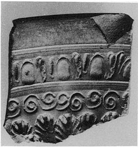 | Description: | Rim fragment from mold for bowl with plain slightly sloping rim. Below rim, a band of large eggs, the ends pointing up; pairs of narrow leaves between each egg. On wall, pairs of spirals; below this, imbricated shell or leaf pattern. | |