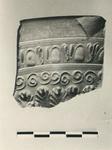 | Description: | Rim fragment from mold for bowl with plain slightly sloping rim. Below rim, a band of large eggs, the ends pointing up; pairs of narrow leaves between each egg. On wall, pairs of spirals; below this, imbricated shell or leaf pattern. | |