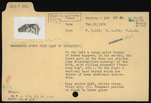 | Description: | To the left of the fragment, a large motif formed of boxed squares. In the cnetre, the lower part of the body and jointed legs (extremities missing) of a bird(?) or horse(?) with filling ornament ("running dog", etc.). To the right a vertical band beyond which are traces of some uncertain decoration. Clay yellow-buff, fairly clean. Thick slip(?). Ornament painted in black to brown glaze. | |