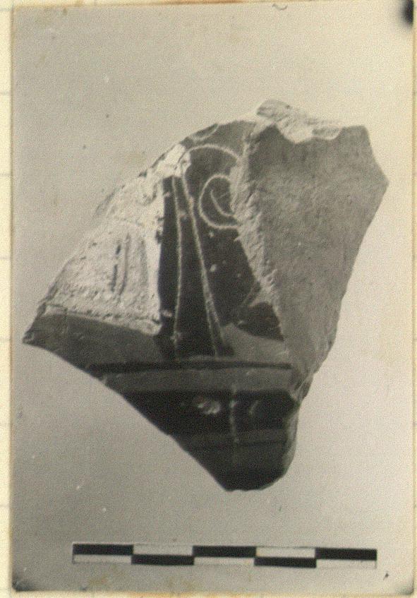 | Description: | Small fragment from upper part of shoulder, preserving part of the face and helmet of Athena, right. Tongue pattern beyond. Details in dilute glaze and incision. Hellenistic. | |