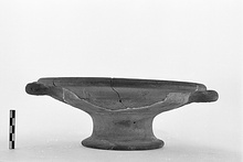 | Description: | Mended from many pieces. About one-third of the rim and sides and a small part of the edge of the foot missing. Restored in plaster. A shallow bowl with slightly offset rim, on a high hollow stand. Two double horizontal handles. Buff clay; unglazed outside; thin red wash on inside. Cf. Agora XXXIII, nos. 202, 203. | |