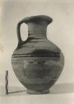 | Description: | Profile complete; most of sides of trefoil mouth missing and gaps in neck and body; restored in plaster. Ovoid body, flaring foot, deeply hollowed beneath. Decoration as P 22259 (Ε 698), except three narrow glaze bands on lower body and one encircling foot; handle barred. Thin fabric, light buff clay; dull red-brown glaze. Submycenaean. | |