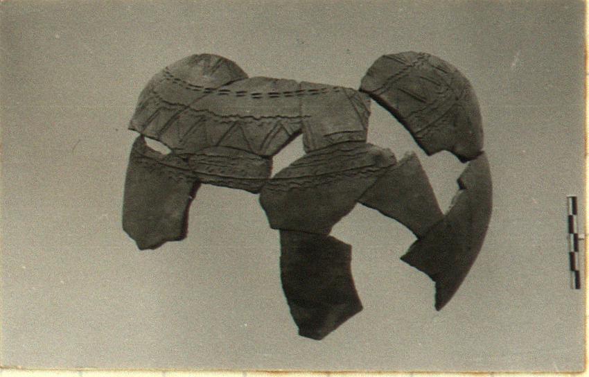 Very elaborate incised decoration on shoulder and start of neck; one plastic bump on shoulder.
