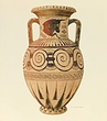 Description:   Mended from many pieces; considerable fragments of lower wall, and small piece from shoulder missing. Restored in plaster. Slender neck-amphora on high flaring ring foot. Broad flaring rim with angular profile. Thickened band handles. Decoration: on foot, checker pattern; on lower body, tall rays, the alternate rays springing not from the base but from a point half way up the zone. Next above, a band of open maeander; then a broad zone filled by large reversed spirals in pairs, each pair joined to the next by a double palmette motif; palmettes also at the mid-point of each pair. On the shoulder, tongues. On the neck, a panel on each side; in it, the forepart of a bull, with one hoof raised, to right. Filling ornament, zigzags, swastikas, diminishing triangles and diamond motif. On the outer face of the rim, triangles.