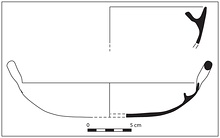 | Description: | Less than one-quarter of rim and side and one handle preserved. Rounded bottom; almost vertical loop handle; no foot; ledge for lid, only a projection to support it. Gritty red clay with a light slip. | |