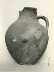 | Description: | Much of the lip missing, and both side handles, with small fragments from the wall. Tall ovoid body; false ring foot; short neck with flaring rim flattened on top. Rolled vertical handle, from middle of neck to shoulder curve; finger impression at bottom. Handmade of micaceous red to brown clay with remains of smoother surfacing, carrying considerable remains of a brown stain (from contact with iron?) both inside and outside neck, on handle and on walls. | |