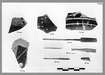 | Description: | Mended from three pieces. From the lower wall of a small but thick-walled open vase. Above two horizontal reserved lines is the outstretched foot of a seated figure with part of the rock(?) on which he sits. Good black glaze outside; thinner glaze inside. No relief contour. | |