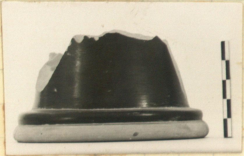 | Description: | Stepped base and start of stem preserved. Pinkish-buff clay. Excellent black glaze. Bottom and lowest member of base reserved; dotted circle in glaze on bottom. Line scratched through glaze at base of wall. Cf. Agora XII, no. 37. | |