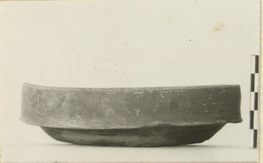 | Description: | About half preserved. Small plate with flat floor and base, oblique wall and heavy, vertical rim. At center of floor, a device stamp: eight-petalled rosette. Soft orange-buff clay; dull reddish glaze inside and over most of exterior. Base left rough from the wheel. | |
