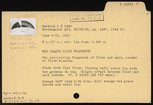| Description: | Two non-joining fragments of floor and wall; center of floor missing. Plate with flat floor, flaring wall; plain lip with two grooves on top. Slight offset between floor and wall inside. Orange-buff clay with bits; dull orange-red glaze inside and under lip. Cf. P 15360 (Late Roman A ware). | |