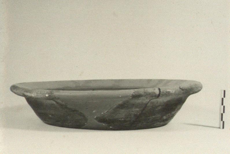 | Description: | About two-thirds preserved; restored in plaster. Flat-floored dish with rounded wall and everted rim sloping upward to the exterior. Coarse reddish-brown cooking ware fabric with bits; unglazed. | |