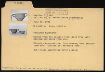 | Description: | Mended from two pieces; tiny piece from wall missing and chips from rim. Slightly inturned rim, flat bottom; band handles from rim. Surface not smoothed over. Buff clay; apparently never glazed. | |