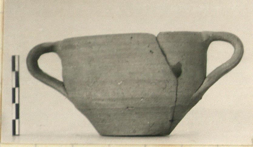 | Description: | Mended from two pieces; tiny piece from wall missing and chips from rim. Slightly inturned rim, flat bottom; band handles from rim. Surface not smoothed over. Buff clay; apparently never glazed. | |