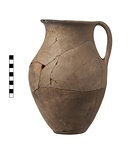 Description:   Mended from several pieces. Small pieces from rim and body missing; restored in plaster. Slightly thickened rim; band handle from lip with thumb impression at lower attachment; flat bottom.