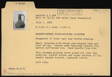 | Description: | Fragments of lower wall and bottom missing. Small oinochoe with broad pear-shaped body and flat bottom. Narrow neck tapering towards top; narrow out-turned rim. Band handle from rim. Thin streaky grayish brown glaze all over exterior, except bottom and upper surface of lip. Handle banded outside, unglazed inside. Buff clay. | |
