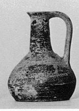 Description:   Fragments of lower wall and bottom missing. Small oinochoe with broad pear-shaped body and flat bottom. Narrow neck tapering towards top; narrow out-turned rim. Band handle from rim. Thin streaky grayish brown glaze all over exterior, except bottom and upper surface of lip. Handle banded outside, unglazed inside.