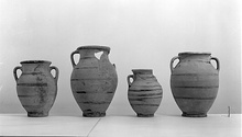 | Description: | Intact except for cracks and slight chips. Ovoid amphora on substantial nearly vertical base; wide neck; rolled rim. Short band handles from middle of neck. Base and rim glazed; bands of body, to base of neck; traces of glaze on handles. Buff clay; dull black glaze much worn. | |