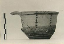 | Description: | Mended from several fragments; part of wall and much of handle missing. Flat bottom; steep walls, narrow rolled rim, projecting. Band handle from rim. Underside reserved; handle banded, outside. The lower wall, the rim and the space just below it reserved and decorated with five (probably originally six) vertical rows of dots. Inside, a reserved line at the rim, and two reserved circles around a dot on the floor. Thin streaky glaze, once blackish inside, and largely peeled; outside fired red at the front, grayish-black at the back towards the handle. | |