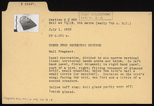 | Description: | Wall fragment. Panel decoration, divided by six narrow vertical lines; horizontal bands above and below. In left hand panel, floral ornament; in right hand panel, part of a bird, right; filling ornament of diamond motif, small swasika; below the bird's tail a small circle (or omicron?). Incision on the bird's wing; facing the bird, one foot and a little of the second creature. Yellow-buff clay; dull glaze partly worn off; inside glazed. | |