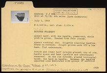 | Description: | Almost half, with one handle, preserved; whole profile given. Mended from four pieces. Almost vertical rim. Slightly slanting handles, round in section. Slight groove sets off a low base, flat underneath. Inside and lower half outside glazed; top of rim, handle space and base (profile and underneath) reserved. On the rim outside, glazed horizontal bands; one band on handle. Between the handles reserved zone decorated with groups of vertical glazed bands and panels between; in the panels degenerated birds. Below the zone four more bands all around. Brownish-red glaze; pink clay. | |