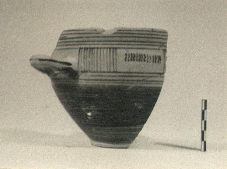 | Description: | Almost half, with one handle, preserved; whole profile given. Mended from four pieces. Almost vertical rim. Slightly slanting handles, round in section. Slight groove sets off a low base, flat underneath. Inside and lower half outside glazed; top of rim, handle space and base (profile and underneath) reserved. On the rim outside, glazed horizontal bands; one band on handle. Between the handles reserved zone decorated with groups of vertical glazed bands and panels between; in the panels degenerated birds. Below the zone four more bands all around. Brownish-red glaze; pink clay. | |