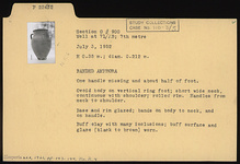 | Description: | One handle missing and about half of foot. Ovoid body on vertical ring foot; short wide neck, continuous with shoulder; rolled rim. Handles from neck to shoulder. Base and rim glazed; bands on body to neck, and on handle. Buff clay with many inclusions; buff surface and glaze (black to brown) worn. | |