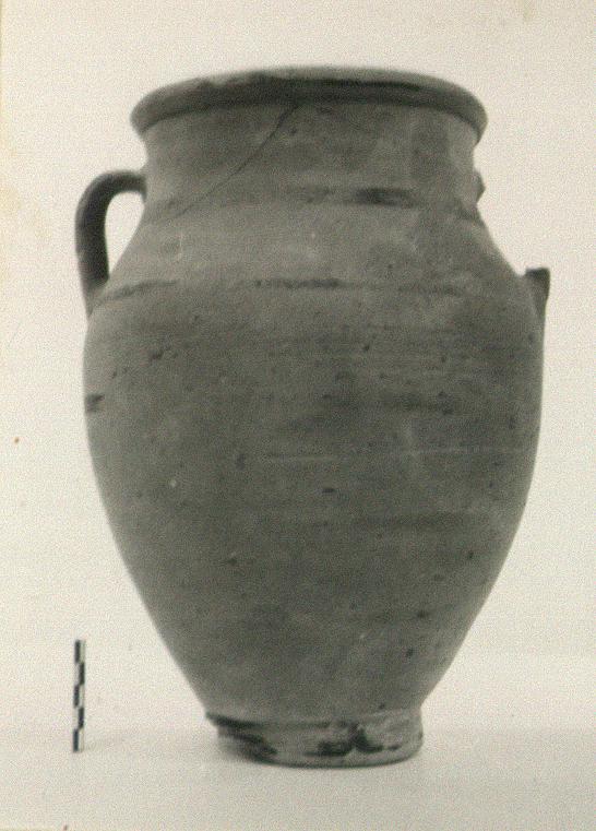 | Description: | One handle missing and about half of foot. Ovoid body on vertical ring foot; short wide neck, continuous with shoulder; rolled rim. Handles from neck to shoulder. Base and rim glazed; bands on body to neck, and on handle. Buff clay with many inclusions; buff surface and glaze (black to brown) worn. | |