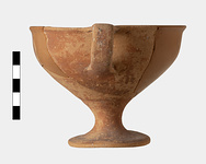 | Description: | Foot, handle and about half of body preserved, mended from several pieces. Restored in plaster. Broad thin foot, short stem, deep bowl; lip slightly everted. Reddish-brown glaze, much worn, dull; over all except beneath foot. Buff clay with bits. | |