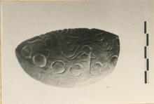 | Description: | Mended from six fragments. Part of shoulder and upper wall only remains. Stamped on shoulder: a garland of ivy leaves bounded above by a row of curved lines, below by a row of circles. Thin light brown to gray glaze; clay fired gray toward inside of vase, brick-red toward the outside; surfaces red. | |