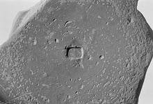 | Description: | Most of foot and floor preserved. From a Samian B cup with flat floor, oblique and flaring wall and low ring foot with groove on resting surface. At center of floor a stamp. Typical clay and glaze. | |